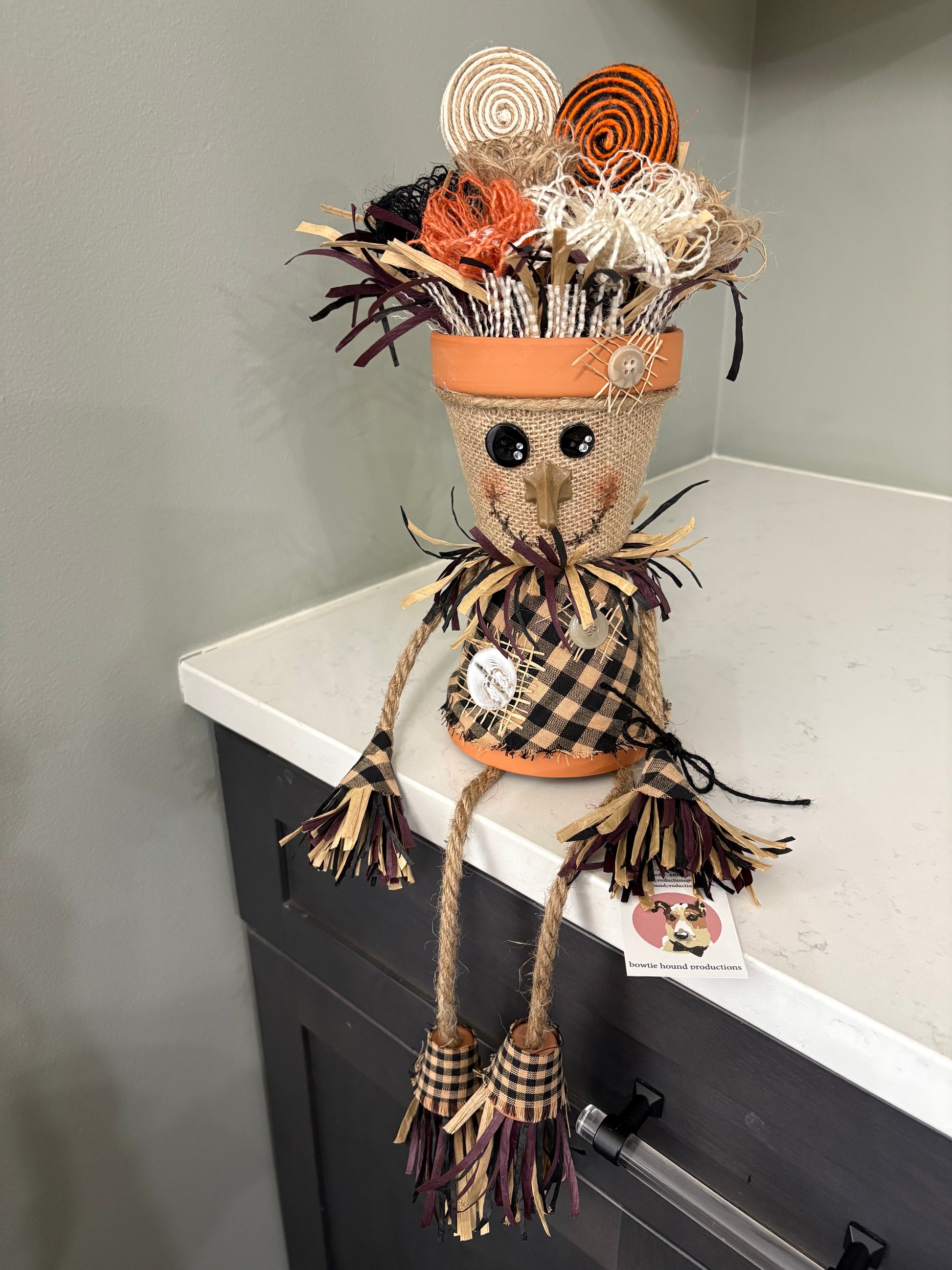 Add this adorable handcrafted scarecrow to any fall decor! Made from 4" terracotta clay pots, this little cutie is hand crafted and designed to charm mantle or table. The flowers and lollipops in the pot are individual and handmade. Each piece is made to order special for you, so choose from the examples below or custom order! Email bowtiehoundproductions@yahoo.com to custom order. Make sure to leave your name and a call back number to discuss options.
